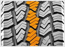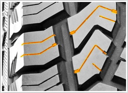Canelurile de forme si adancimi diferite, dispuse pe toata suprafata benzii de rulare imbunatatesc capacitate de tractiune si eliminarea apei, a noroiului sau a zapezii topite de pe banda de rulare, pastrand permanent anvelopa in contact drumul. |