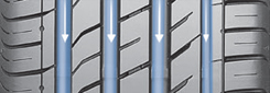 Cele 4 caneluri principale dispuse longitudinal pe banda de rulare, asigura o evacuare eficienta si rapida a apei, pastrand in permanenta anvelopa in contact cu solul, reducandu-se astfel riscul de aparitie a acvaplanarii.